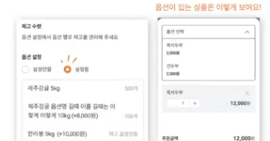 여섯 번째,옵션 설정하기. 옵션을 설정하기를 누르면 상품의 크기 용량 등 구매할 때 선택해야 되는 다양한 옵션을 선택 할 수 있다고 합니다. 각 옵션별로 추가 금액과 재고 수량을 설정할 수 있다고 합니다. 옵션을 최대 10개까지 추가할 수 있다고 합니다.