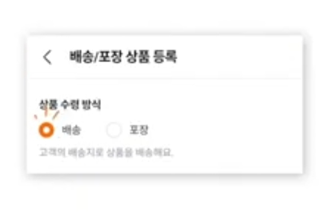 두 번째, 상품 수령 방식 선택. 상품수령 방식을 배송과 포장으로 선택해야 한다고 합니다. 선택한 상품에 따라서 다음으로 이어질 항목들이 달라지 게 된다고 합니다. 한 번 선택한 타입은 수정할 수 없으니 주의해서 선택을 해야 한다고 합니다. 만약 등록한 상품 수령 방식을 바꾸고 싶다면 등록한 상품을 삭제한 후에 원하는 상품수령방식으로 선택해서 다시 등록을 해 주면 된다고 합니다.