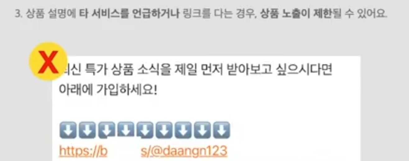 세 번째, 상품설명에 타 서비스 언급이나 링크 금지. 상품 설명에 타 서비스를 먼저 언급하거나 타 서비스로 이동하는 링크를 다는 경우에 상품 노출이 제한될 수 있다고 합니다.