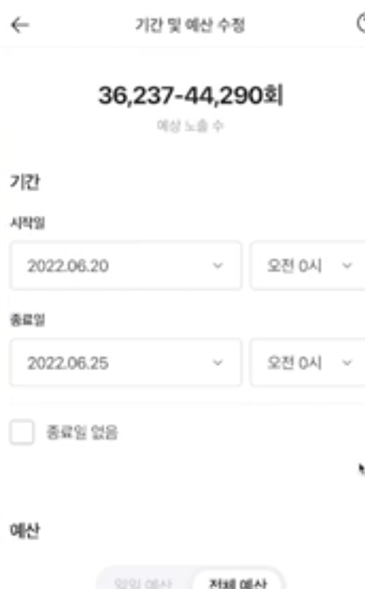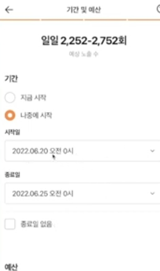 다섯 번째 단계 , 예산과 기간 설정하기. 기간 설정하기. 기간은 광고가 승인이 되고 바로 광고를 시작하는 경우에는 [지금 시작]을 선택하면 되고, 승인되고 바로 말고 특정한 타이밍에 시작하겠다고 한다면 [나중에 시작]을 선택하면 된다고 합니다. 원하는 날짜를 선택하고 시작할 수 있게 할 수도 있고, 시작을 선택하고 종료일이 따로 없고 예산이 소진될 때 계속 광고를 하고 싶은 경우에는 [종료일 없음]을 눌러주면 종료일이 없어진다고 합니다. 시작일과 종료일에 시간까지 설정하게 되어 있는데 선택지에서는 시간을 선택할 수 없다고 합니다. 선택지만 보면 시간을 설정하지 못한다고 생각할 수 있는데 광고를 다 만들고 광고 상세에서 목록을 보면 기간 옆에 연필모양을 선택하면 시간 선택할 수 있는 것이 보이게 된다고 합니다. 광고를 만들 때는 시간 설정할 수 없지만 광고를 만들어 놓고 나면 시간까지 설정할 수 있다고 합니다.