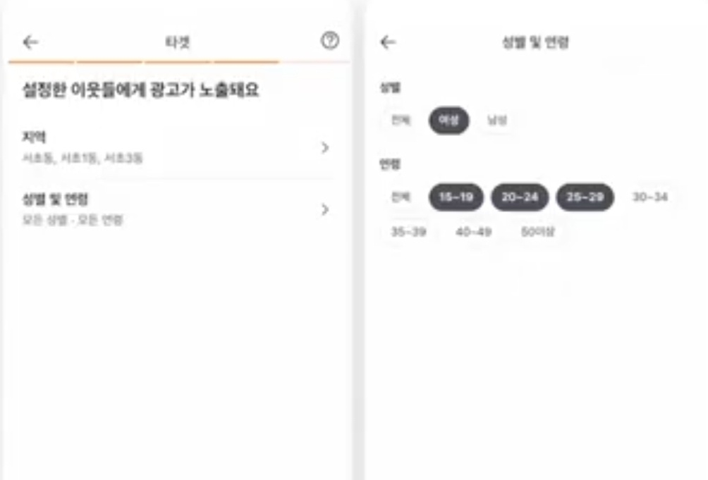 네 번째 단계, 성별& 연령 타겟팅. 성별과 연령 타겟팅은 특정 성별이나 연령대에만 광고를 하는 것을 의미한다고 합니다. 피드광고의 경우 특정 지역 ,성별 연령을 골라서 광고를 내보낼 수 있다고 합니다. 설정한 지역과 성별 연령대의 사람들만 가게 광고를 보게 된다는 의미로 보면 된다고 합니다.