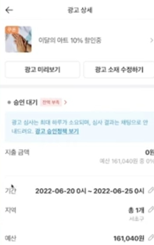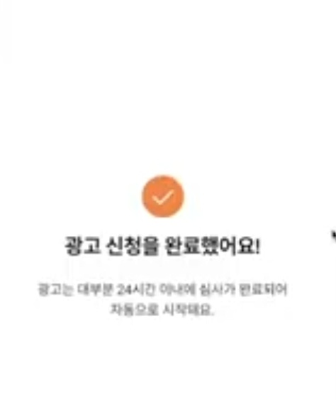 광고신청을 완료하면 승인심사에 들어가고 광고 심사는 최대 24시간 정도 최대 걸리고 바로 시작을 설정해 두었다면 승인이 통과되는 순간 바로 광고가 나가게 되고 , 특정한 기간을 설정했다면 승인 상태로 기다렸다가 설정한 시작일에 광고가 나가게 된다고 합니다.