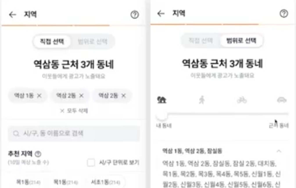 세 번째 단계, 광고할 지역 선택하기. 지역은 가게가 등록된 주소지 기반으로 기본 설정이 되어 있다고 합니다. 여기서 지우고 싶은 동네를 지우거나 , 더하고 싶은 동네가 있으면 더 할 수도 있다고 합니다. 동 단위가 너무 작다고 생각하면 시/구 단위로 보기를 누르고 원하는 구를 넣으면 된다고 합니다. 행정 구역별로 선택을 하고 싶지 않는 경우에는 범위로 선택을 눌려서 걸어서 올 수 있는 범위, 자전거 탈 수 있는 범위, 자동차 탈 수 있는 범위로 범위를 변경하면 된다고 합니다.