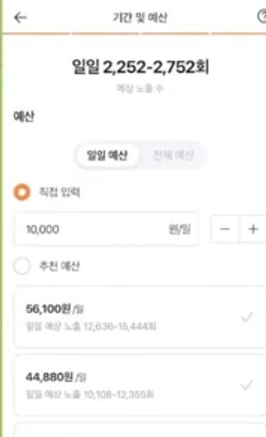 예산 설정하기. 예산 설정하기에는 일일 예산을 설정하거나 전체예산을 설정하루 수 있다고 합니다. 일일예산은 하루에 광고비를 얼마 쓸 것을 정하는 단계라고 보면 된다고 합니다. 하루에 1만 원,1만 오천 원, 2만 원 식으로 원하는 금액을 정하면 된다고 합니다. 전체예산은 전체 예산 광고 기간 내내 얼마를 쓸지 정하고 싶다고 한다면 전체예산을 선택하면 된다고 합니다. 8만원을 광고에 쓰더라도 하루에 얼마씩 쪼개서 예산을 두고 쓸지, 하루에 얼마 나가든 상관없이 전체 광고예산을 쓰고자 하는 목저에 따라 선택을 하면 된다고 합니다. 광고에 얼마를 써야할지 감이 없는 경우에는 직접 입력대신 아래에 추천 예산을 선택하면 광고하기로 한 지역기반으로 대략 추천해주는 예산 세트가 있다고 합니다. 제시해주는 광고예산에서 지불하고 싶은 비용을 선택하고 광고를 집행해 보는 방법도 있다고 합니다. 추천 예산을 써서 광고를 해보고 성과가 얼마가 나오는지 보고 예산을 조정해 보면 된다고 합니다.