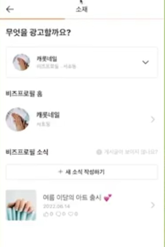 두 번째 단계, 소재 선택하기. 비즈프로필 홈 선택. 비즈프로필 홈을 선택하면 광고가 어떻게 보이는 지 미리 보기가 나오게 되고, 광고에 실제로 보여 질 내용들을 수정 할 수가 있다고 합니다. 비즈프로필에 등록한 프로필 사진이랑 비즈프로필 이름이 보이며 홈피드에 보여 지는 미리보기를 통해 광고소재 수정하기를 클릭해서 수정하고 싶은 것을 수정하면 된다고 합니다. 제목에 이달의 10% 할인 같은 문구를 넣어주고 다시 스크롤을 위로 올려서 미리보기를 통해 어떻게 광고가 나갈지 확인을 해보면 된다고 합니다. 사진도 바꾸고 싶다면 다른 사진을 선택해서 넣으면 된다고 합니다. 비즈프로필광고의 사진이랑 제목을 변경하다고 해서 원래 비즈프로필 사진이랑 이름이 바뀌는 것은 아니라고 합니다. 광고에 보일 내용만 바뀐다고 보면 된다고 합니다.