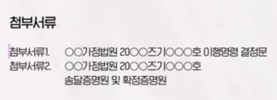 첨부서류는 이행명령 결정문과 송달증명원 및 확정증명원을 제출하면 된다고 합니다. 이행명령 결정문과 확정증명원을 제증명 신청을 통해 발급받을 수 있고, 우편신청이나 전자소송 사이트에서 온라인으로 발급 받을 수 있다고 합니다.