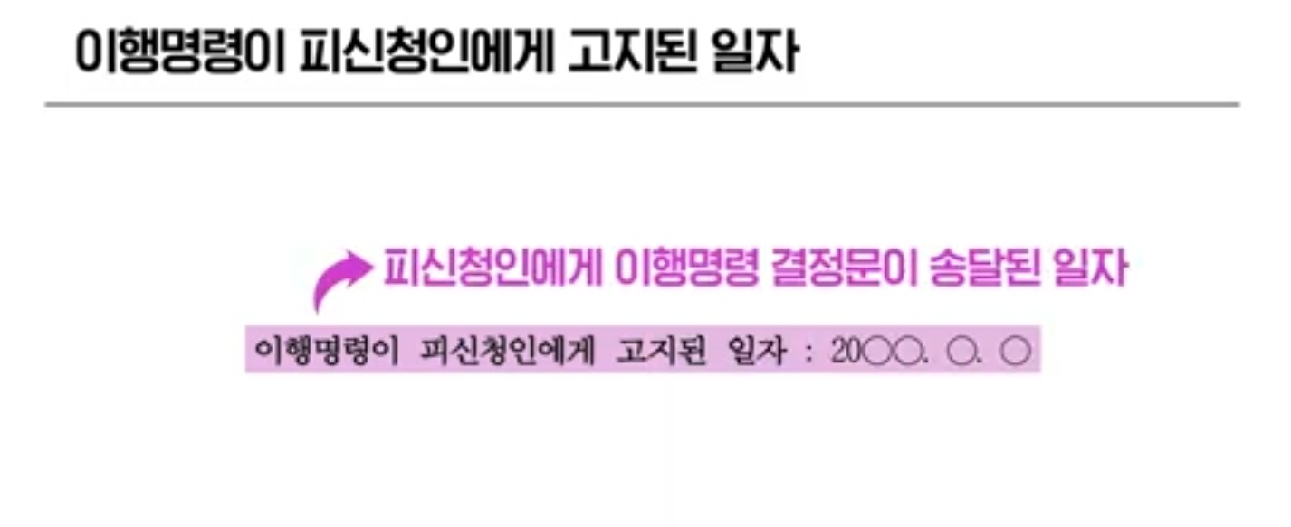 이행명령이 피신청인에게 고지된 일자는 피신청인에게 이행 명령 결정문이 송달된 일자를 말한다고 합니다.