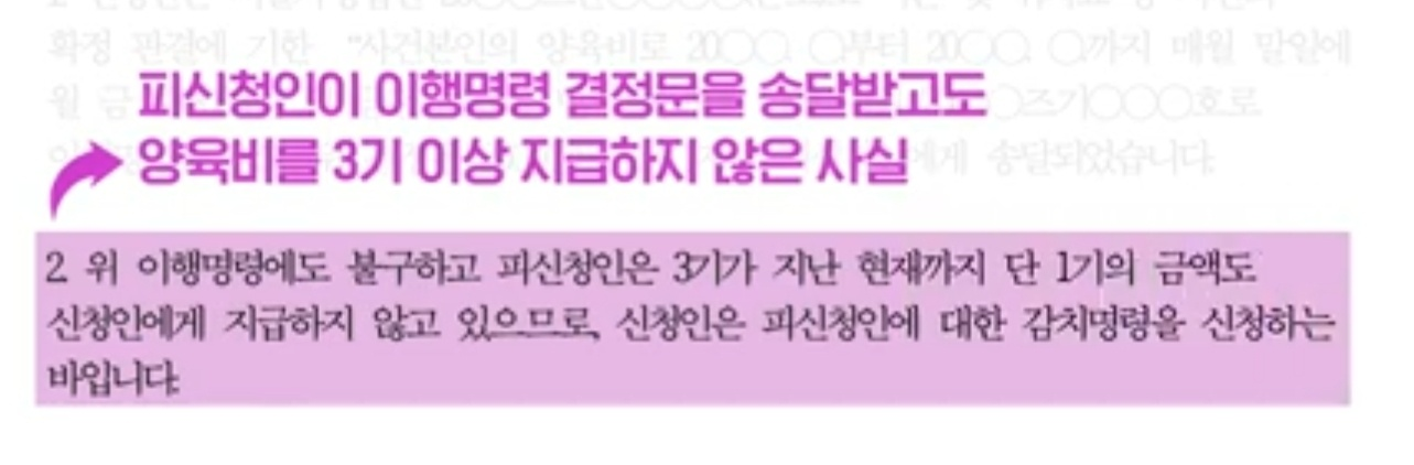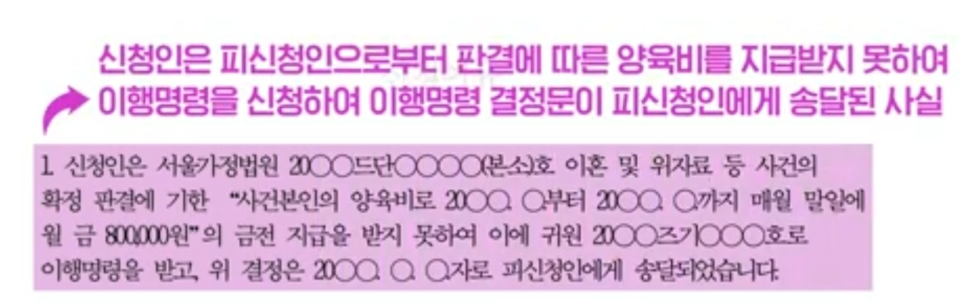그러나 피신청인이 이행명령 결정문을 송달받고도 양육비를 3기 이상 지급하지 않은 사실을 순서대로 기재하면 된다고니다. 이렇게 신청이유를 기재할 때에는 어떠한 집행권원을 근거로 하여 피신청인에게 양육비 지급 의무가 발생하였는지 함께 기재하는 것이 좋다고 합니다.