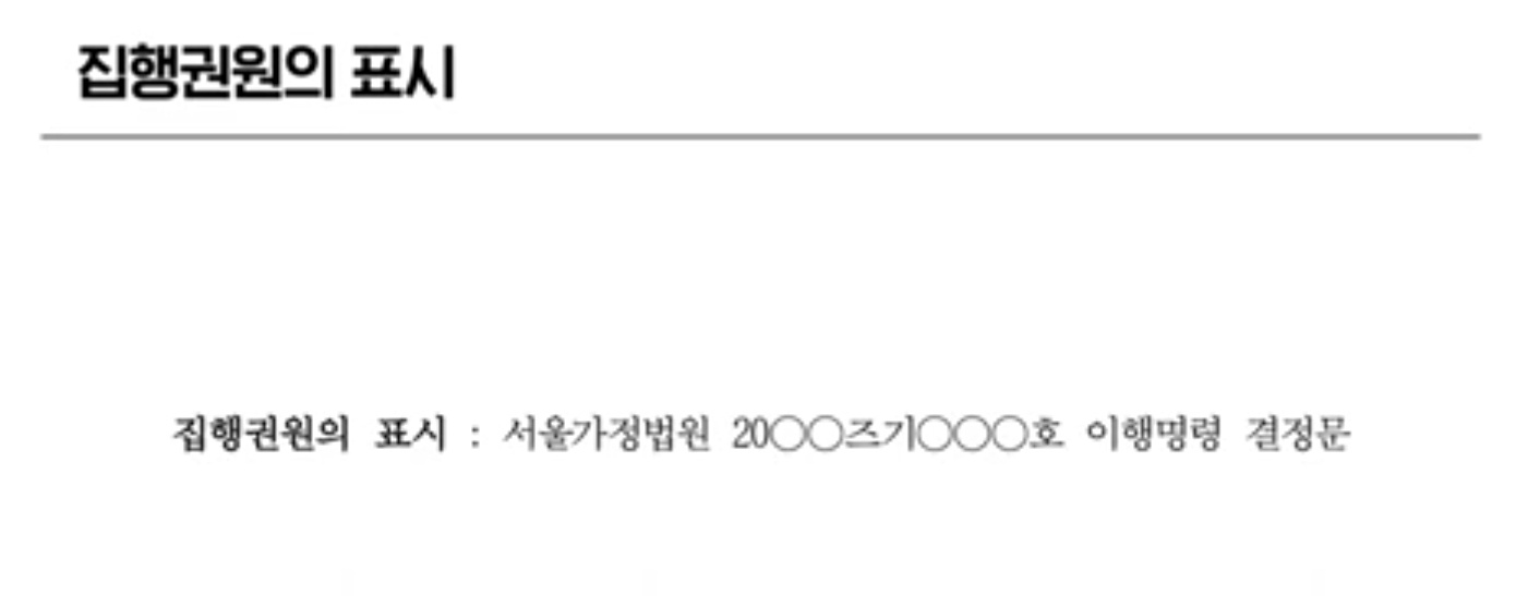 집행권의 표시에서 집행권원이란 확정된 판결문이나 결정문, 심판문, 조정조서와 같이 집행력이 있는 문서를 말하며 집행권원은 이행명령 결정문이기 때문에 집행권원의 표시에 이행명령의 사건 번호를 기재하면 된다고 합니다.