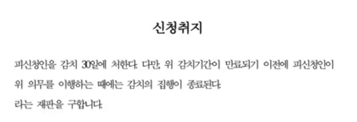 신청취지는 피신청인을 감치30일에 처한다. 다만, 위 감치기간이 만료되기 이전에 피신청인이 위 의무를 이행하는 때에는 감치의 집행이 종료된다. 라는 재판을 구합니다. 라고 작성하면 된다고 합니다.