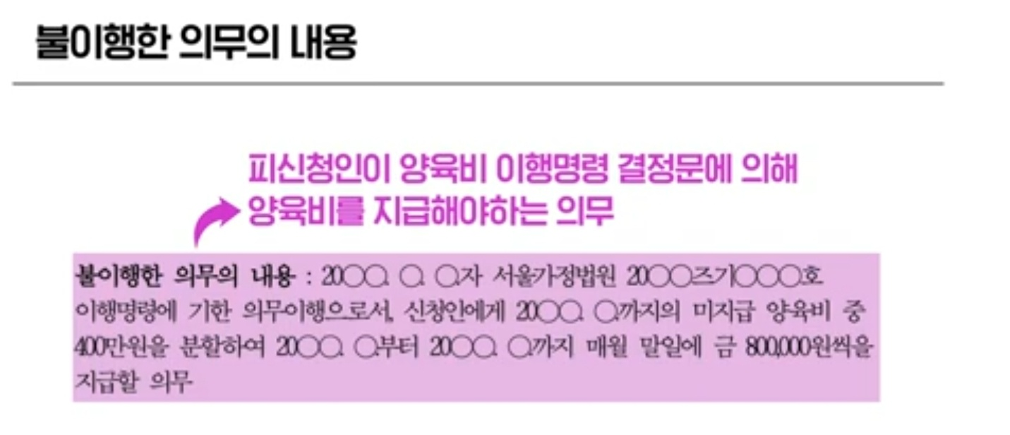 불이행한 의무의 내용은 피신청인이 양육비 이행명령 결정문에 의하여 양육비를 지급해야하는 의무를 말한다고 합니다. 그래서 이행명령 결정문 주문과 동일하게 기재하면 된다고 합니다.