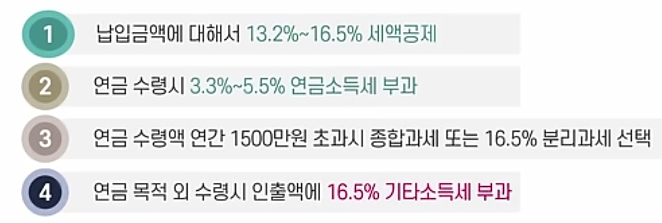 세 번째,연금계좌- 연금저축,IRP(분리과세). 납입금액의 소득 수준에 따라 13.2%에서 16.5% 세액공제가 된다고 합니다. 연금 수령 시 3.3%에서 5.5% 연금 소득세가 부과 된다고 합니다. 연금 수령액 연간 1500만 원 초과 시 종합과세 또는 16.5% 분리과세 선택이 가능하다고 합니다. 연금 목적 외 수령 시 인출액에 16.5% 기타소득세 부과가 된다고 합니다.
