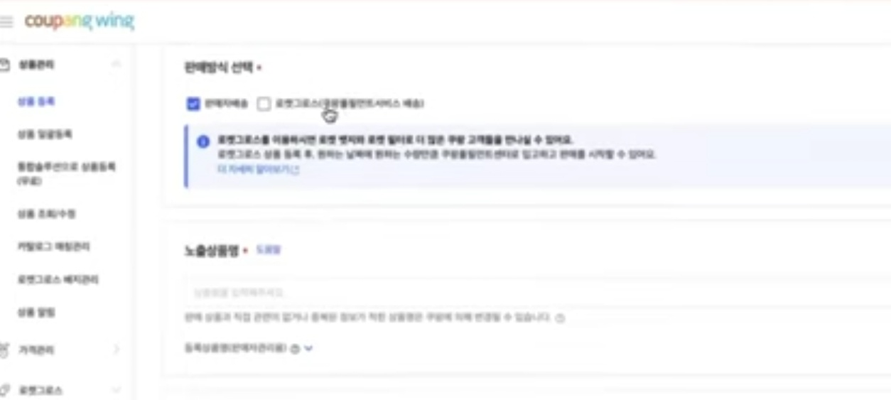 쿠팡 윙 홈페이지에 접속하여 로그인을 하고 상품관리> 상품등록을 눌러 로켓그로스로 상품을 등록하기 위해서는 판매 방식 선택이 필요하다고 합니다. 판매방식을 쿠팡 풀필먼트 서비스 배송을 선택해 주면 된다고 합니다. 판매자 배송, 로켓 그로스를 모두 선택해서 한 번에 등록하여 진행도 가능하다고 합니다. 로켓 그로스만 선택해서 상품 등록도 가능하다고 합니다. 판매 방식을 선택했다면 노출 상품명을 입력하면 된다고 합니다.