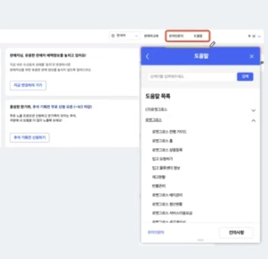 로켓그로스를 시작하거나 진행할 때 궁금한 점이 있어 궁금한 점을 확인 하는 방법은 마켓플레이스 우측 상단에 온라인 문의 및 도움말을 통하여 상세 가이드 및 자주 묻는 질문에 대한 확인이 가능하다고 합니다.